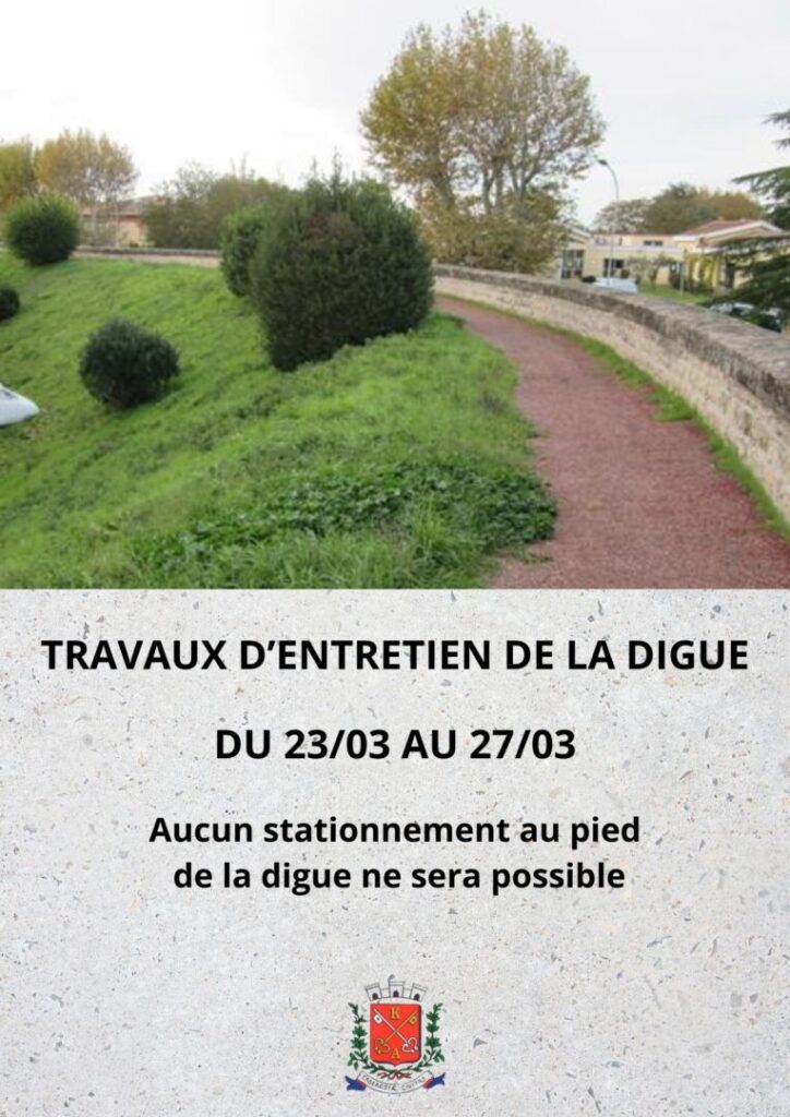 Débroussaillage de la digue par l’entreprise Rieu à compter du 23 mars prochain. Pour permettre aux agents de l’entreprise de pouvoir intervenir dans les meilleures conditions, il est demandé à chacun et chacune de pouvoir respecter les arrêtés portant interdiction de stationnement en pied de digue.